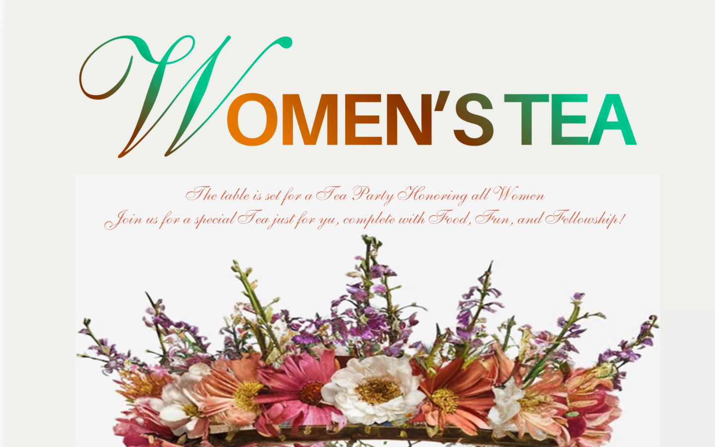 The table is set for a Tea Party Honoring all Women. Come join us for a special Tea just for YOU, complete with Food, Fun, and Fellowship. The theme and scripture of this year's event is,